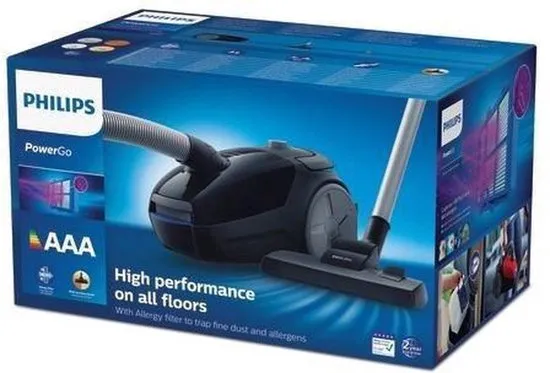 De Philips FC8241/09 stofzuiger is energiezuinig, maakt perfect schoon op harde vloeren en heeft een efficiënt allergiefilter waardoor de uitblaaslucht wordt gefilterd. De stofzakken gaan 50% langer mee en behouden hun zuigkracht, ook wanneer de zak bijna schoon is. Voordelen van de Philips FC8241/09 Allergiefilter houdt 99,9% van de stofdeeltjes tegen Topklasse schoonmaakresultaat op harde vloeren Accessoires altijd bij de hand, netjes opgeborgen in de stofzuiger Energiezuinige stofzuiger met allergiefilter Deze Philips-stofzuiger scoort goed in drie verschillende categorieën: energieverbruik, heruitstoot van stof en reiniging op harde vloeren. Gemakkelijke zakken die lang meegaan S-zakken gaan tot 50% langer mee en zorgen voor het behoud van de volledige zuigkracht van uw stofzuiger tot het moment waarop ze vol zijn. Eén zak past op alle modellen, met een afdichtmechanisme om de zak netjes te kunnen weggooien. Gecertificeerd allergiefilter Ons Clean Air-filtersysteem vangt 99,9% van fijnstof op, waaronder pollen, haar van huisdieren en huisstofmijt, en is ideaal voor mensen met een allergie en in het algemeen voor mensen die een hygiënischere omgeving wensen. Als allergievriendelijk gecertificeerd door ECARF. Grote capaciteit van 3 liter De grote stofkamercapaciteit kan een volle zak van drie liter aan voordat de zak moet worden vervangen. Groot bereik van 9 meter Met een bereik van 9 meter van stekker tot mondstuk kunt u langer schoonmaken zonder loskoppelen. Handige geïntegreerde accessoires Accessoires, zoals een handige spleetzuigmond, zijn geïntegreerd in de stofzuiger zodat u ze altijd bij de hand hebt wanneer u stofzuigt. Telescopische buis voor comfort Een 2-delige telescopische metalen buis is snel af te stellen op elke hoogte voor comfortabel reinigen. Product informatie en inhoud set:- Merk: Philips- Serie: PowerGo- Model: FC8241/09- Inclusief: parketborstel + kleine opzetborstel- Type filter: HEPA 13 (99,95% filtering) - Kleur: zwart- Energieklasse: A- Energielabel AAA- Jaarlijks gemiddeld energieverbruik: 27,9 kWh ( ca. 6 a 7 euro per jaar)- Stof opname harde vloeren:A- Stof opname hoogpolig tapijt: D- Stof uitstoot klasse: A- Geluidsniveau: 77 dB- Filter is vervangbaar- Actieradius: ca. 9 Meter- Snoerlengte: ca. 6 Meter- Type buis: 2-delige metalen telescoopbuis- Buiskoppeling: active lock- Type wielen/materiaal: rubber- Type stofzak: S-zakken en gaan tot 50% langer mee- Inhoud opvangreservoir/stofzak: max. 3 Liter- Voeding: 230V - 50Hz-60Hz- Ingangsvermogen (IEC): 750 Watt- MAximaal vermogen: 750 Watt- Productgewicht: 4,3 KG- Afmetingen van product: ca. 40,3cm lang x 26,3cm breed x 22cm hoog- CE goedgekeurd- Handleiding- Garantie: 2 jaar, Bezoek de Philips website en bekijk alle gegevens voor de garantie.